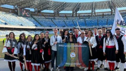 Cervinara: la Pro Loco Angelo Renna balla la Ndrezzata nello stadio Maradona. Non capita tutti i giorni di esibirsi all’interno dello stadio Diego Armando Maradona di Napoli. Sarà certamente una giornata indimenticabile per il gruppo folk della Pro Loco Angelo Renna di Cervinara che ha ballato la ndrezzata per tutte persone intervenute alla cerimonia di premiazione delle medaglie d’oro della Libertas.