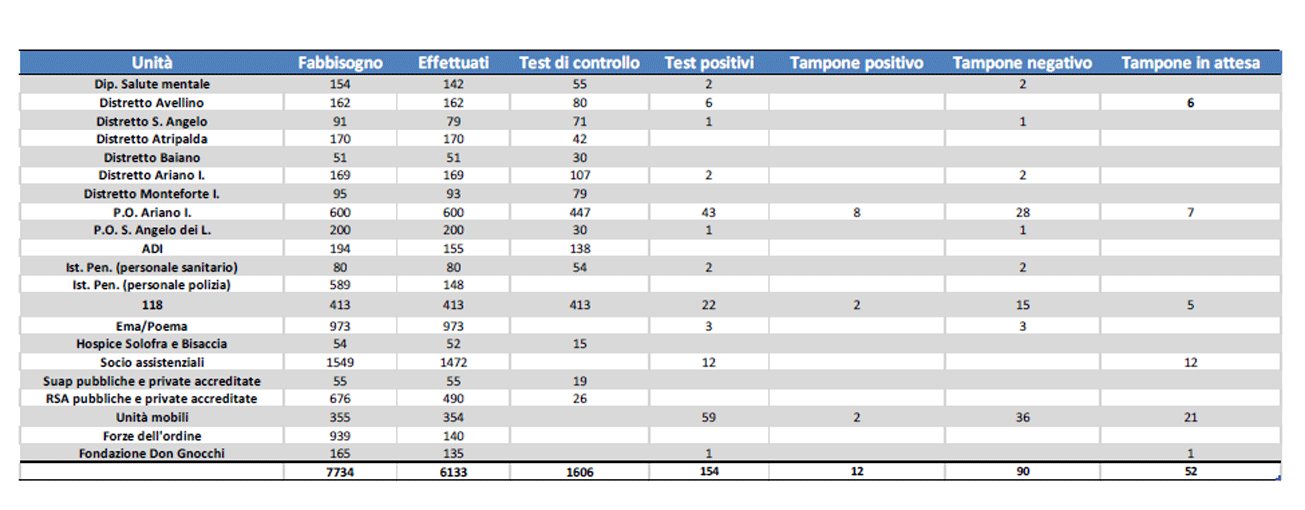 I test sono stati fatti alle categorie considerate a rischio tra cui operatori sanitari dei Distretti, del Dipartimento di Salute Mentale, dell’ADI, degli Istituti penitenziari, del 118; pazienti e personale dei Presidi Ospedalieri, degli Hospice.