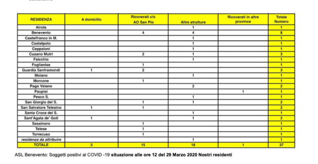 L’Asl di Benevento ha appena inviato il report delle persone contagiate in tutto il territorio provinciale. L’ Azienda Sanitaria Locale conta 37 persone colpite dal Covid- 19 e le elenca comune per comune. Mancano, però, i tre contagiati di Paolisi, quindi, i positivi sono 40. E’ stata la stessa Asl a comunicare, nella serata di ieri, la notizia dei tre positivi al sindaco di Paolisi Umberto Maietta.