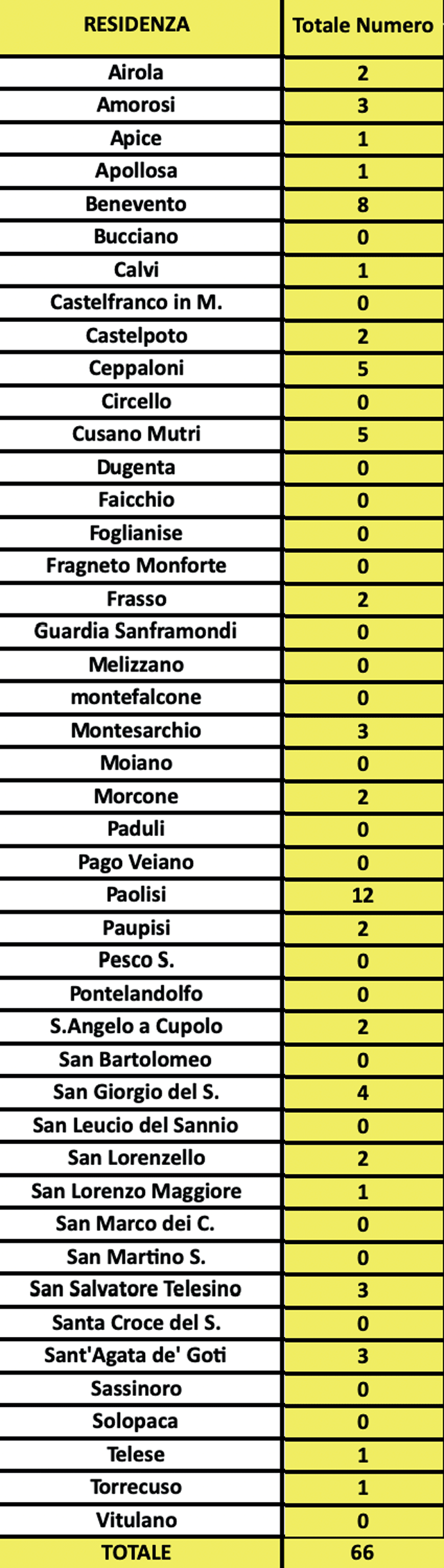 In particolare i paesi sanniti della valle caudina presentano questa situazione: Airola 2; Montesarchio 3; Paolisi 11; Sant’Agata de’ Goti 3; Bucciano, Moiano, Bonea, Pannarano, Forchia e Arpaia non hanno contagiati.