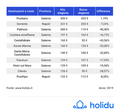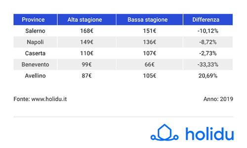 La provincia di Salerno con i suoi 168€ in alta stagione e 151€ in bassa, risulta essere la provincia con il costo medio più elevato di tutta la regione; un dettaglio interessante si riferisce ai dati riguardanti i prezzi medi nazionali, dove questa provincia si classifica 4° tra tutte le presenti nella nostra penisola. A seguire troviamo la provincia di Napoli, con un prezzo medio per gli affitti di 149€ al giorno nel periodo estivo e di 136€ in bassa stagione. Entrambe le province detengono questo primato regionale grazie alle isole e alle molte località costiere, che fungono da principale richiamo per il turismo estivo della regione.