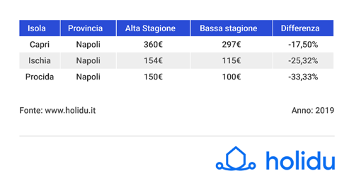 Capri, Ischia e Procida, sono le tre isole più importanti della regione Campania che da sempre esercitano un forte richiamo turistico in particolar modo nel periodo estivo. Tutte e tre le isole rientrano nel territorio di Napoli, arricchendo così il lustro di questa provincia. La classifica da noi stilata, dove sono presenti le maggiori isole italiane, vede Capri posizionarsi seconda con un costo medio di 360€ a notte in alta stagione e di 297€ in bassa. Con una differenza esigua tra loro, Ischia e Procida (rispettivamente 154€ e 150€ in alta stagione) si posizionano invece 2° e 3° nella classifica regionale come costi medi delle isole. L’isola di Procida, nello specifico, raggiunge un significativo 33,33% di risparmio diventando la destinazione ideale per una vacanza nel periodo meno gettonato dell’anno.