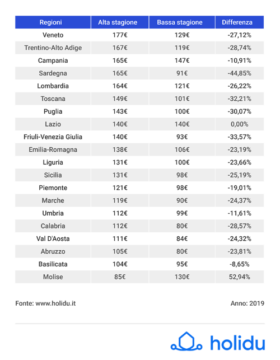 I dati sui prezzi delle case vacanza sono stati estrapolati dal database di Holidu a gennaio 2019. Le date scelte per l’alta e bassa stagione in tutti i paesi europei sono dal 03.08.2019 – 10.08.2019 1 e dal 14.09.2019 – 21.09.2019. Sono stati presi in considerazione appartamenti con una capienza da 3 a 8 persone ed è stata calcolata la mediana del prezzo al giorno (eliminando i duplicati). Non sono stati presi in considerazione i dati per le località con meno di 5 alloggi.