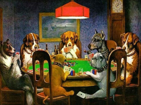 Una delle opere più famose – e allo stesso tempo più stravaganti – ispirata al gioco d’azzardo è la tela “Cani che giocano a poker” del pittore statunitense Cassius Marcellus Coolidge. Non si tratta, in realtà, di una tela unica, ma di ben sedici tele che rappresentano cani in pose tipicamente umane, di cui nove dedicate al gioco del poker. Gruppi di cani riuniti intorno a un tavolo, dunque, con tanto di cappelli, pipe, giacche e bottiglie di whisky. La storia che sta dietro a questi dipinti è molto particolare: questi, infatti, vennero tutti commissionati a Coolidge dalla società pubblicitaria Brown & Bigelow, e rappresentarono all’inizio del XX secolo un vero e proprio punto di svolta nell’arte e un’anticipazione della pop art. Nel corso dell’ultimo secolo, la fama di questa serie di quadri sarebbe cresciuta talmente tanto da aver contribuito alla vendita all’asta di due dei dipinti: “A Bold Bluff” e “Waterloo”. Entrambi sarebbero stati venduti a New York per l’impressionante cifra di 590.400 mila dollari, una cifra decisamente alta per rappresentazioni di questo tipo.