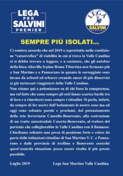 Con un manifesto che sarà affisso a breve nei cantoni cittadini, la Lega per Salvini premier di San Martino attacca: il nostro paese è troppo isolato. Gli esponenti del partito di Salvini invocano una presa di posizione netta da parte della Amministrazioni di San Martino e Pannarano. Ecco il testo completo del manifesto:
