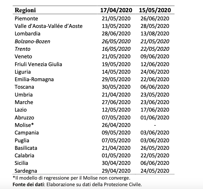 Tali previsioni sono state calcolate sulla base dei dati messi a disposizione quotidianamente dalla Protezione Civile nel periodo che va dal 24 febbraio al 15 maggio”. I modelli statistici elaborati per ogni Regione sono di tipo regressivo (di natura non lineare) e approssimano l’andamento dei nuovi casi osservati nel tempo interpolandoli con una curva.