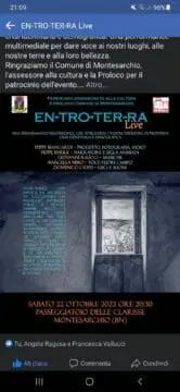 Per questo nasce “Entroterra”, spettacolo performativo che attraverso immagini visive,testi poetici, musica e luci vuole sottolineare questo esodo giovanile. L’arte ancora una volta si fa denuncia , si fa messaggio, si fa veicolo per rimarcare la solitudine dei luoghi e di chi resta, avendo perso il proprio ruolo identificativo a favore di una omologazione urbana che rende le vita ciascune lontane dalle altre. L’indifferenza che ne viene fuori rattrista i cuori per ciò che non è più memoria, per ciò che viene perso nei ricordi e nelle emozioni.