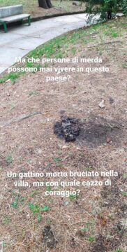 “Questa mattina mio figlio – scrive la donna – si è recato nella Villa comunale di Montesarchio ed ha avuto uno spiacevole incontro. Un gattino morto bruciato, nell’area destinata ai giochi dei più piccoli. Io non ho parole, giudicate voi…”