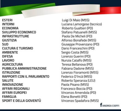 Luciana Lamorgese all’Interno. Roberto Gualtieri all’Economia. Luigi Di Maio agli Esteri. Nunzia Catalfo al Lavoro. Dario Franceschini alla Cultura. Francesco Boccia agli Affari regionali. Vincenzo Spadafora allo Sport. Alfonso Bonafede alla Giustizia. Lorenzo Guerini alla Difesa. Stefano Patuanelli allo Sviluppo. Teresa Bellanova alle Politiche agricole. Sergio Costa resta all’Ambiente. Paola De Micheli alle Infrastrutture. Lorenzo Fioramonti all’Istruzione. Roberto Speranza alla Salute. Federico D’Incà ai Rapporti con il Parlamento. Paola Pisano all’Innovazione tecnologica. Fabiano Dadone alla Pubblica Amministrazione. Giuseppe Provenzano al Sud. Elena Bonetti alle Pari Opportunità. Enzo Amendola agli Affari Europei.