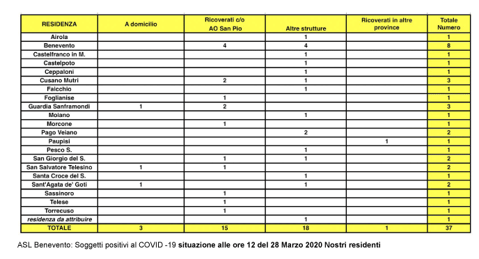 Sono confermati i due di Sant’Agata de’ Goti, e quelli di Airola e Moiano. Benevento è la più colpita con otto casi, seguita da Cusano Mutri con tre. Complessivamente in provincia di Benevento sono 37 i contagiati, tre sono seguiti a casa, 15 sono ricoverati al San Pio e 18 in altre strutture ospedaliere. Per il momento nessun caso accertato a Montesarchio e Paolisi.