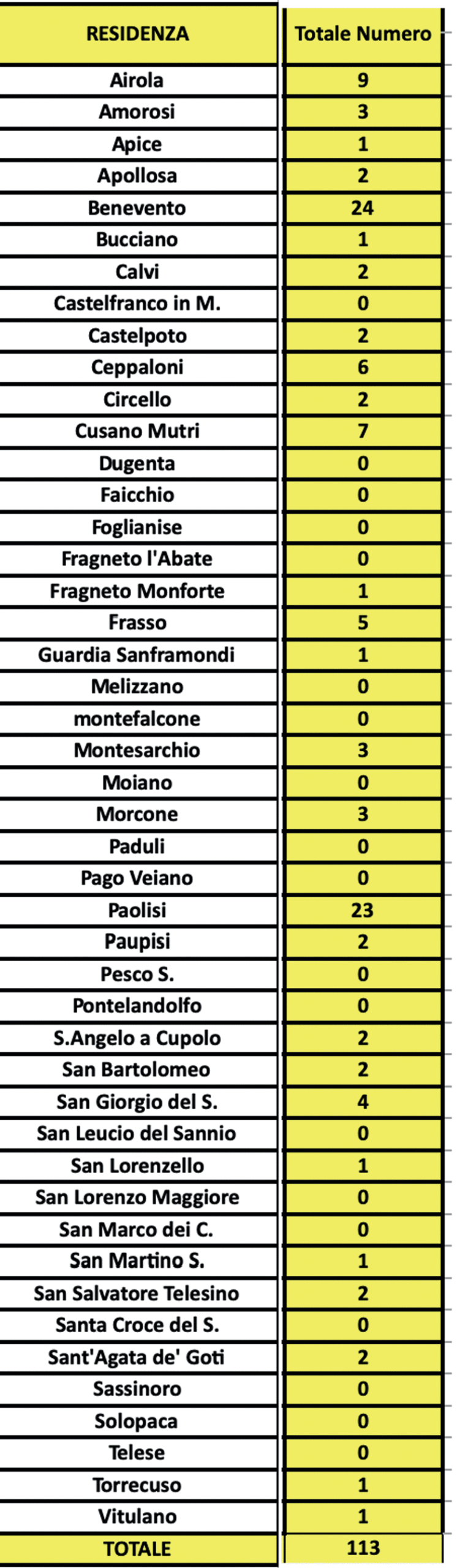 In particolare i paesi sanniti della valle caudina presentano questa situazione: Airola 9; Bucciano 1; Montesarchio 3; Paolisi 23; Sant’Agata de’ Goti 2; Moiano, Bonea, Pannarano, Forchia e Arpaia non hanno contagiati.