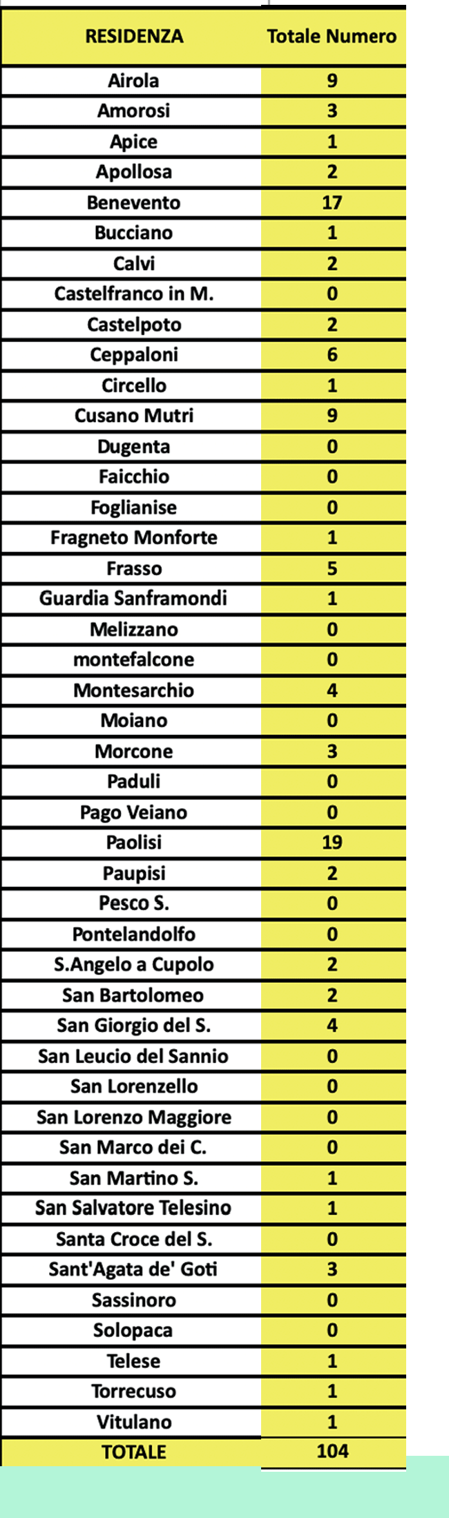 Complessivamente i colpiti da Covid-19 sono 104, con due focolai, uno a Benevento, legato alla vicenda di Villa Margherita e l’altro a Paolisi, non più zona rossa, dove ora i contagiati sono scesi a 19.