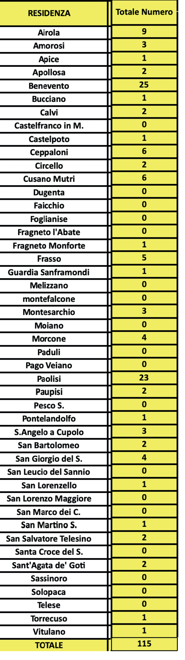 In particolare i paesi sanniti della valle caudina presentano questa situazione: Airola 9; Bucciano 1; Montesarchio 3; Paolisi 23; Sant’Agata de’ Goti 2.