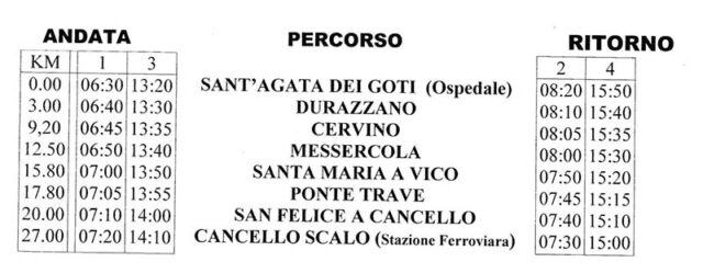 Con una nota pervenuta nei giorni scorsi dalla Giunta Regionale della Campania, Direzione Generale per la Mobilità è stato previsto l’inserimento di due coppie di corse giornaliere volte a collegare S. Agata de’ Goti con Cancello scalo attraversando anche il comune di Durazzano.