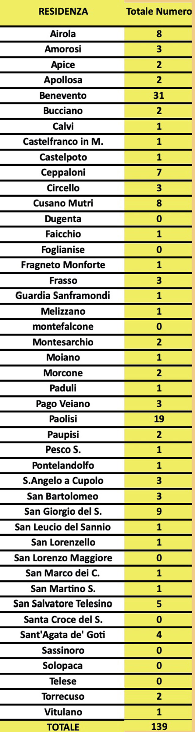 In particolare i paesi sanniti della valle caudina presentano questa situazione: Airola, 8; Bucciano, 2; Montesarchio, 2; Moiano, 1; Paolisi, 19; Sant’Agata de’ Goti, 4.